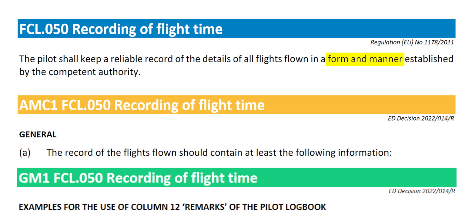 Recording of flight time is regulated by the Implementing Rule annex FCL.050 (blue section in the image).