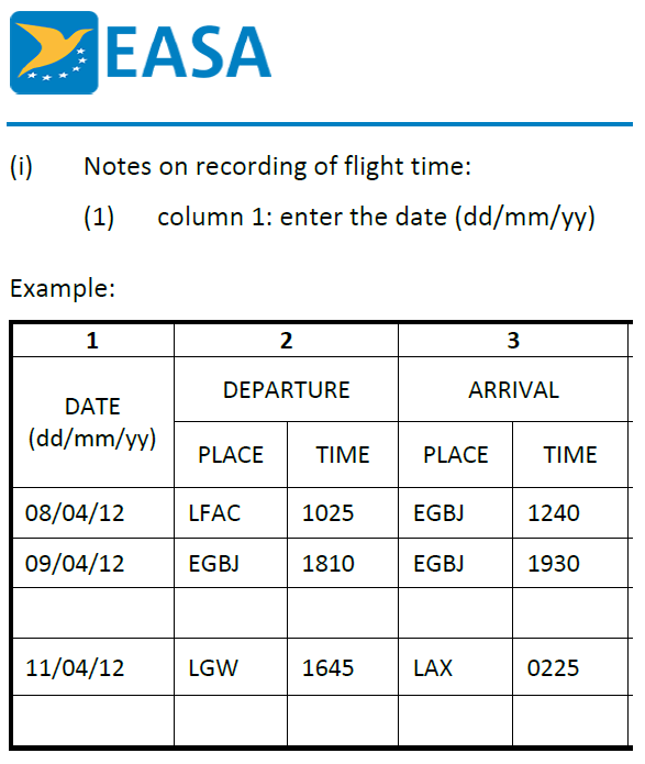 La formulation de cette section indique clairement que les entrées doivent être faites en UTC, ce qui est également notre recommandation, quels que soient le lieu et le type de vol. Cependant, certains pilotes volant uniquement au niveau régional enregistrent les données en heure locale (LT) et les autorités compétentes acceptent ces enregistrements dans la plupart des cas.