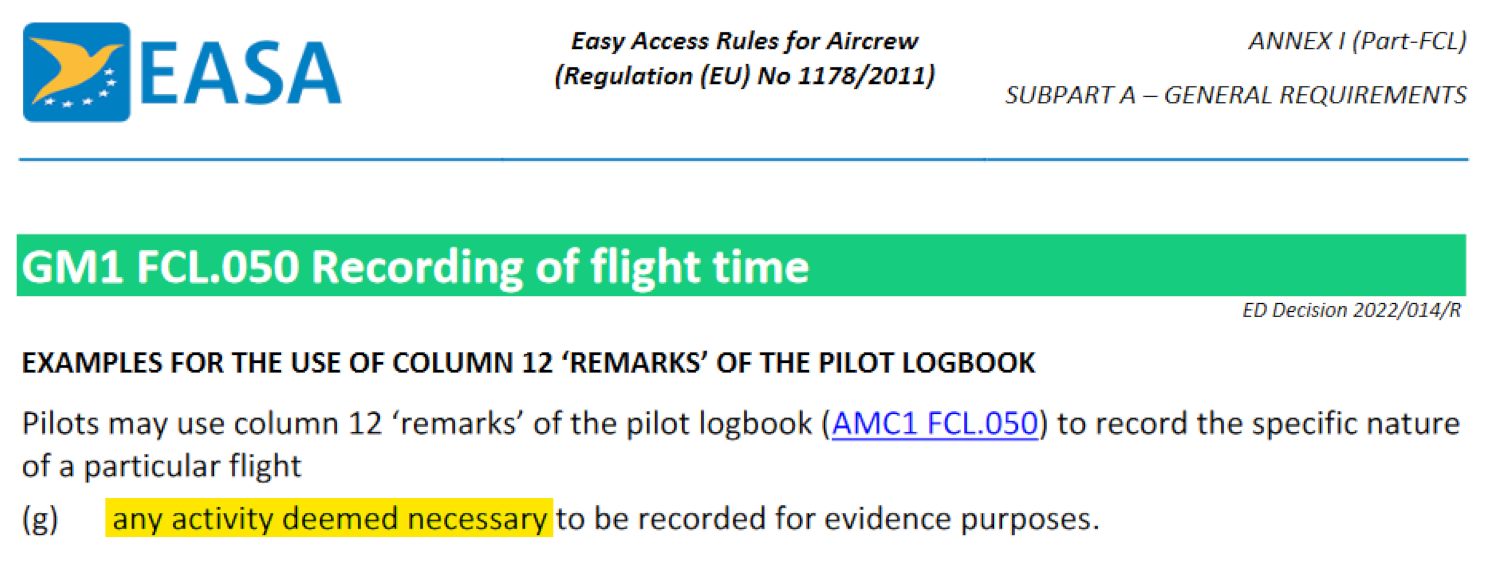 La liste des exemples fournis n'est en aucun cas exhaustive et il incombe au pilote de décider ce qu'il doit inclure. Même les données requises par d'autres chapitres de la Partie-FCL ou d'autres réglementations, telles que les variantes volées, les vols en tant qu'examinateur, pour n'en citer que quelques-unes, ne sont pas explicitement spécifiées. Cela conduit à des entrées incohérentes et à des variations dans les carnets de vol, ce qui rend difficile la vérification de l'expérience.